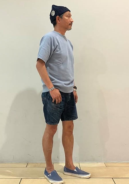 「スウェットTシャツ×デニムショーツ」のサーフ系カジュアルスタイル。