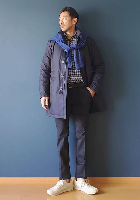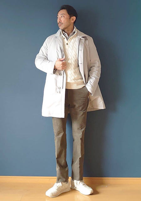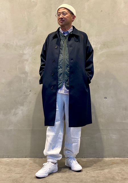 モダンなステンカラーコートを、イージーパンツでカジュアルダウン。