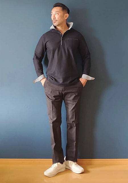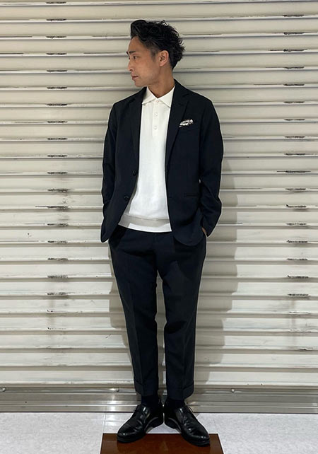黒セットアップに白ポロシャツを合わせた、万人受けする万能なドレススタイル。