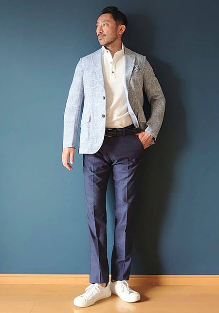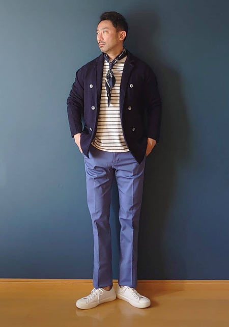 アメトラの代表格「6ボタンのネイビーブレザー」を、スウェット&スニーカーで現代的カジュアルに昇華。