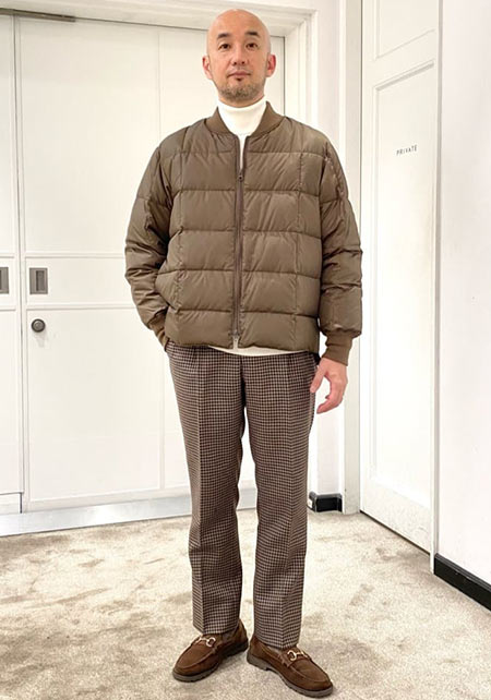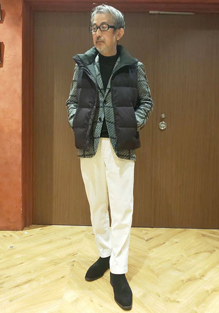 ダウンベストはスエードっぽい素材ゆえ、ラグジュアリー感が光ります。