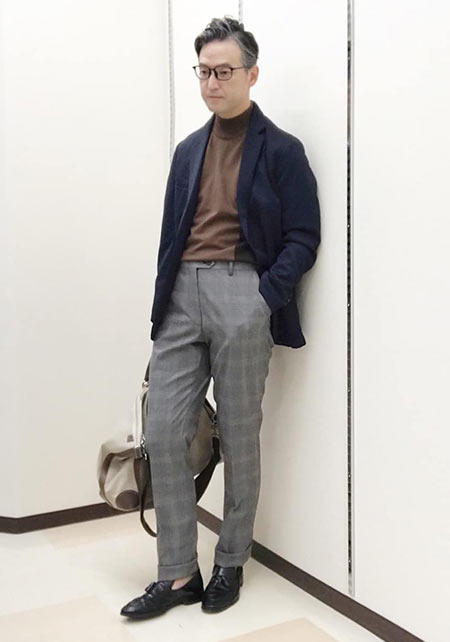 紺ジャケットのハズシとして、グレーのチェック柄パンツを。