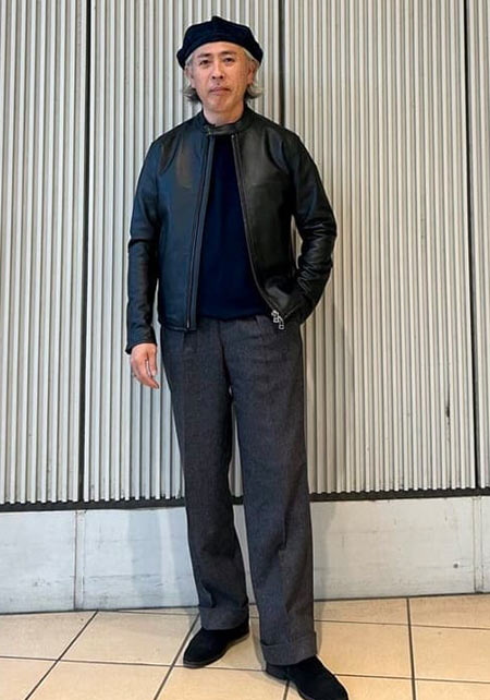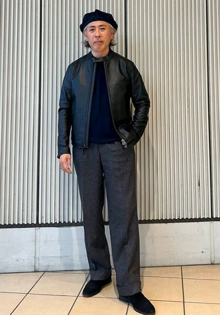男らしいシングルライダースにウールパンツを合わせた着こなし。