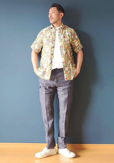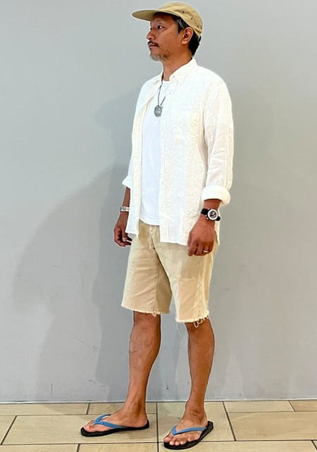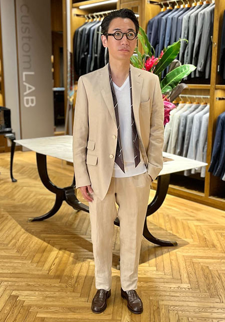 王道のジャケパンであり、リネン混+リネンシャツで夏らしく。