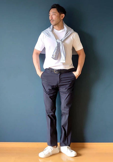 足元は王道的な白スニーカー。全体的に紺色基調にすることで上品めに。