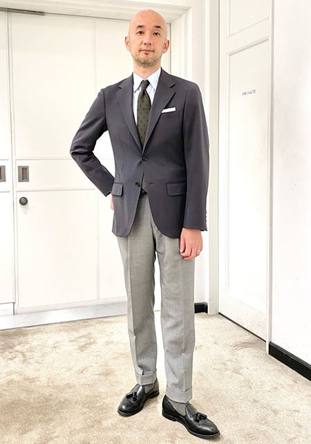 とにかく定番中の定番。「紺ジャケット×グレースラックス」のジャケパンスタイル。