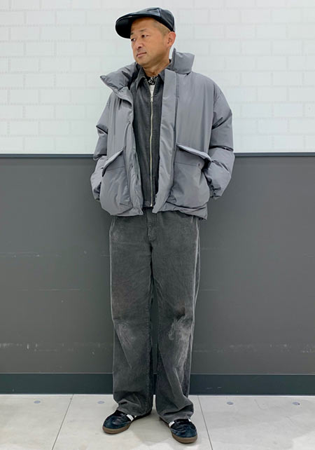 休日感の出る、表情豊かな生地のセットアップを使った着こなし。