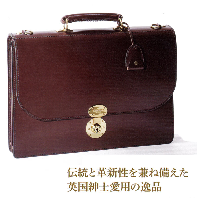 大きなフラップが特徴的なブリーフは、ブライドルレザーの堅牢性に加え、ショルダーストラップを兼ね備えて実用性も高い。英国王室の名だたる面々が御用達なのも納得の名品である。
