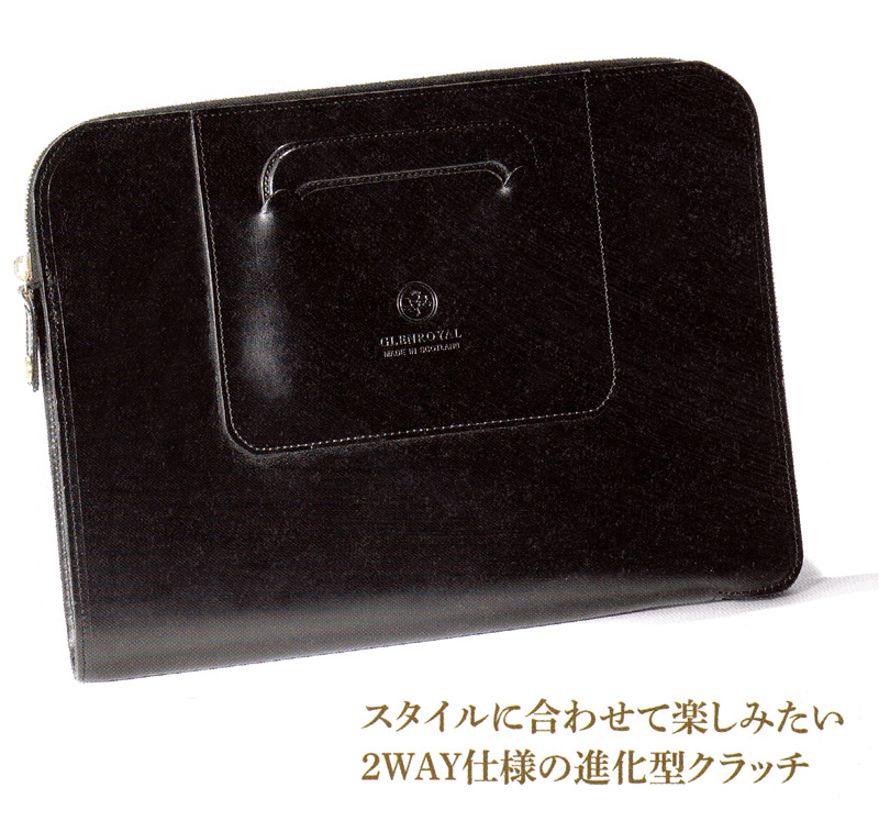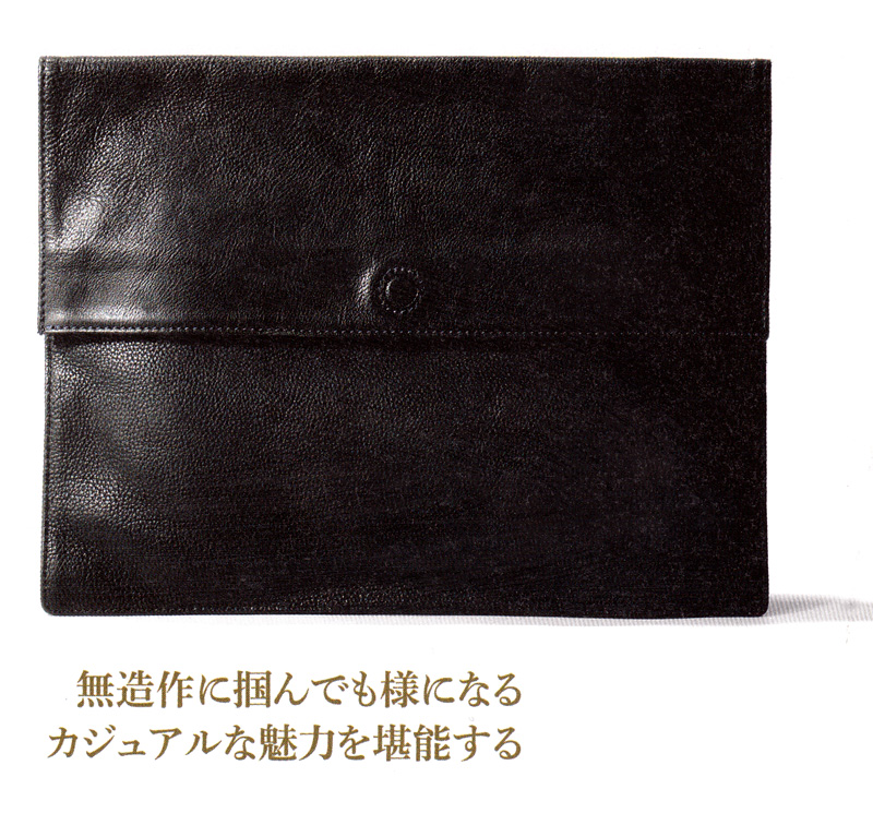 一見普通のクラッチに見えるが、伸縮可能な持ち手によってブリーフとしても使える変り種。ギミックを用いながら品の良さを損なわないのは、素材とデザインの質の高さの賜物に他ならない。