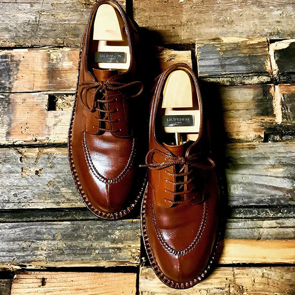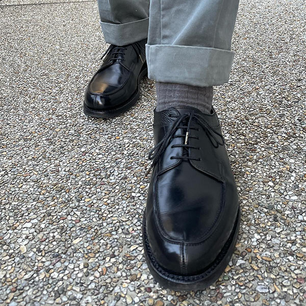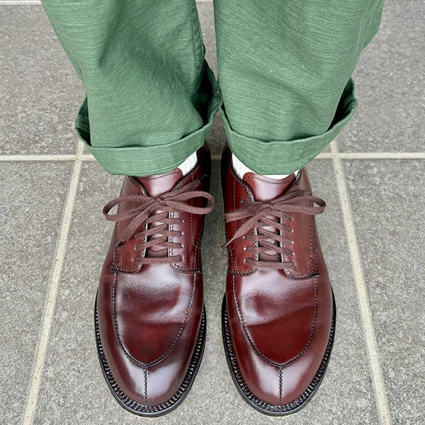 トラッドな2アイレットに無骨なステッチがポイントとなり、シンプルながら存在感を漂わす。こちらもシェルコードバンが使用されており、履き込むことでオーナーの足型に馴染む。