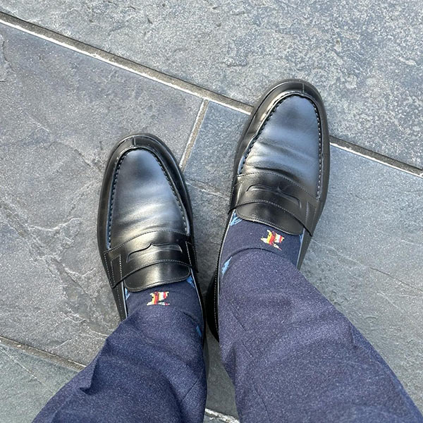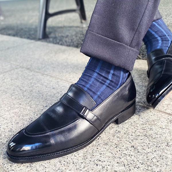 同ブランドの二大定番のうちのひとつであるランシュータイプ。イタリア男の定番のカラーリングである青×黒の配色が、大人っぽさを助長します。