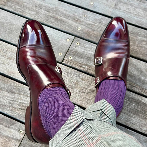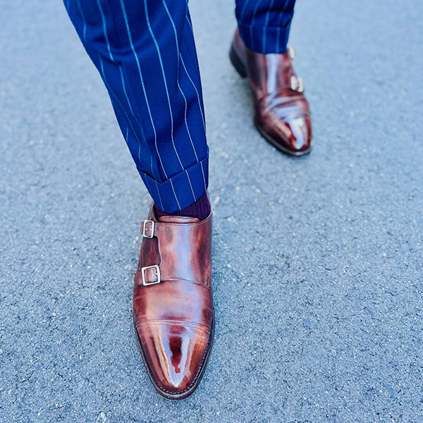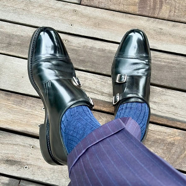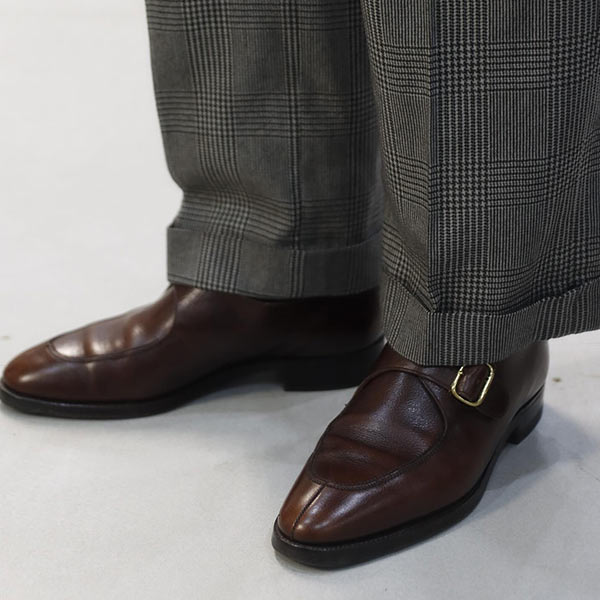 サフィアーノというシボ調の革を用いたトリプルモンクシューズ。光の調子や角度で、いろいろな表情をもたらす繊細な色使いも同ブランドの魅力。ストラップを一つ外して洒落に着崩したい一足。