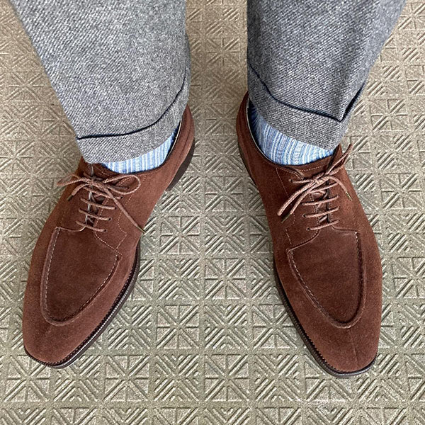 英国靴らしいスウェードのストレートチップは、ドレスアップした雰囲気。使用している木型「103」は、セミロングノーズでカカトが小さく、ウエストの絞りが強いデザイン。堅牢なグッドイヤーウェルテッド製法を採用。