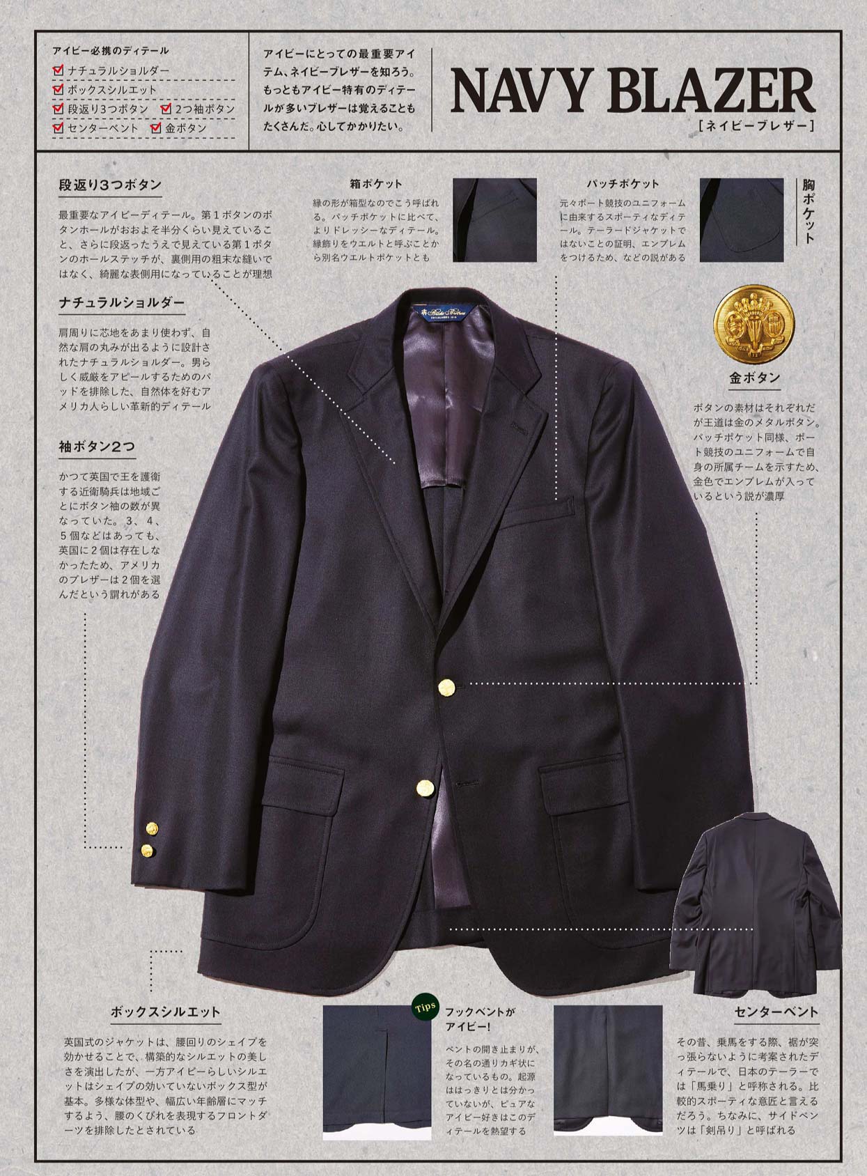 伝統的なドレススーツがサイドベンツなのに対し、紺ブレはセンターベントが基本。乗馬用に考案されたセンターベントにより、動きやすく、見た目も軽快でスポーティに。