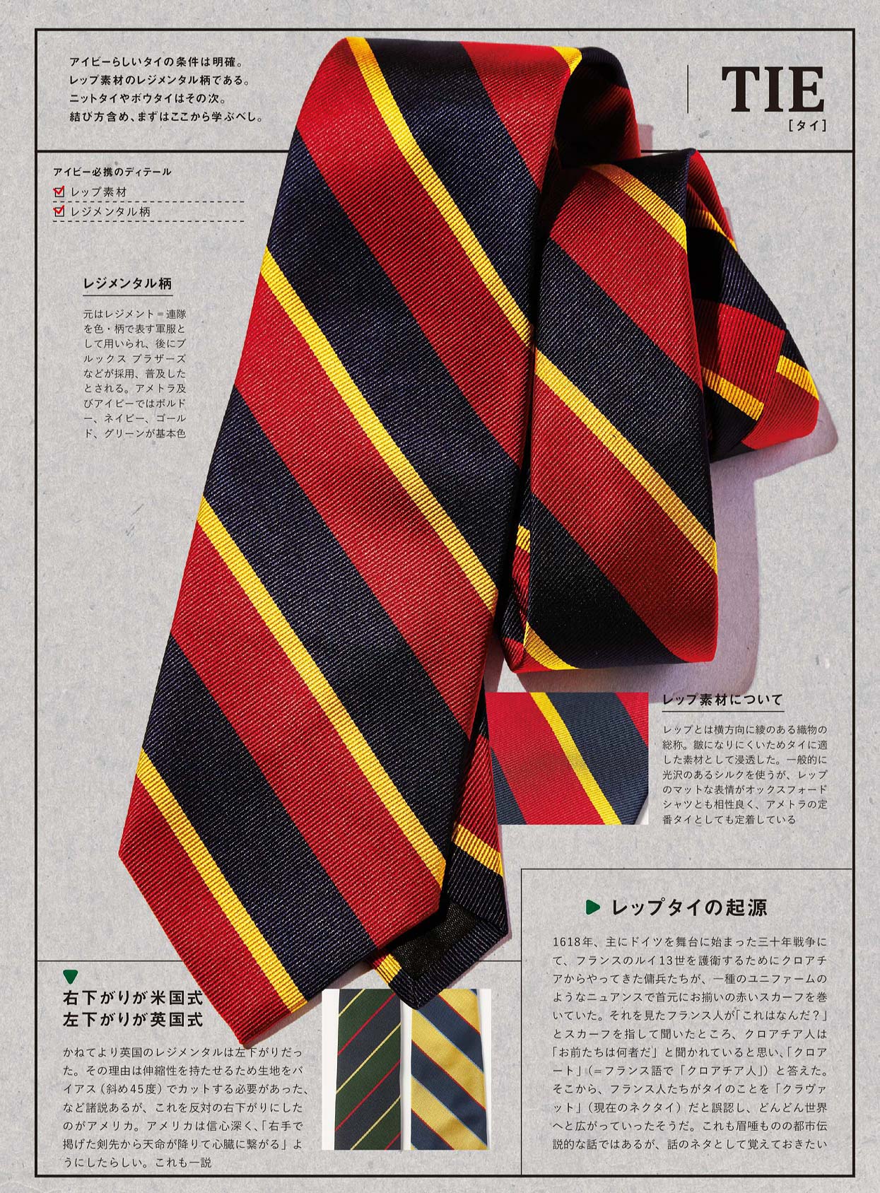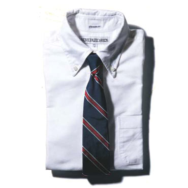 無地の白シャツと、右下がりのストライプ柄が入ったレジメンタルタイ。この組み合わせがアメトラの王道であり定番。左下がりのストライプは英国式なので、アメトラには必ず右下がりを用います。
