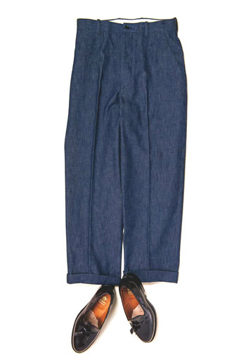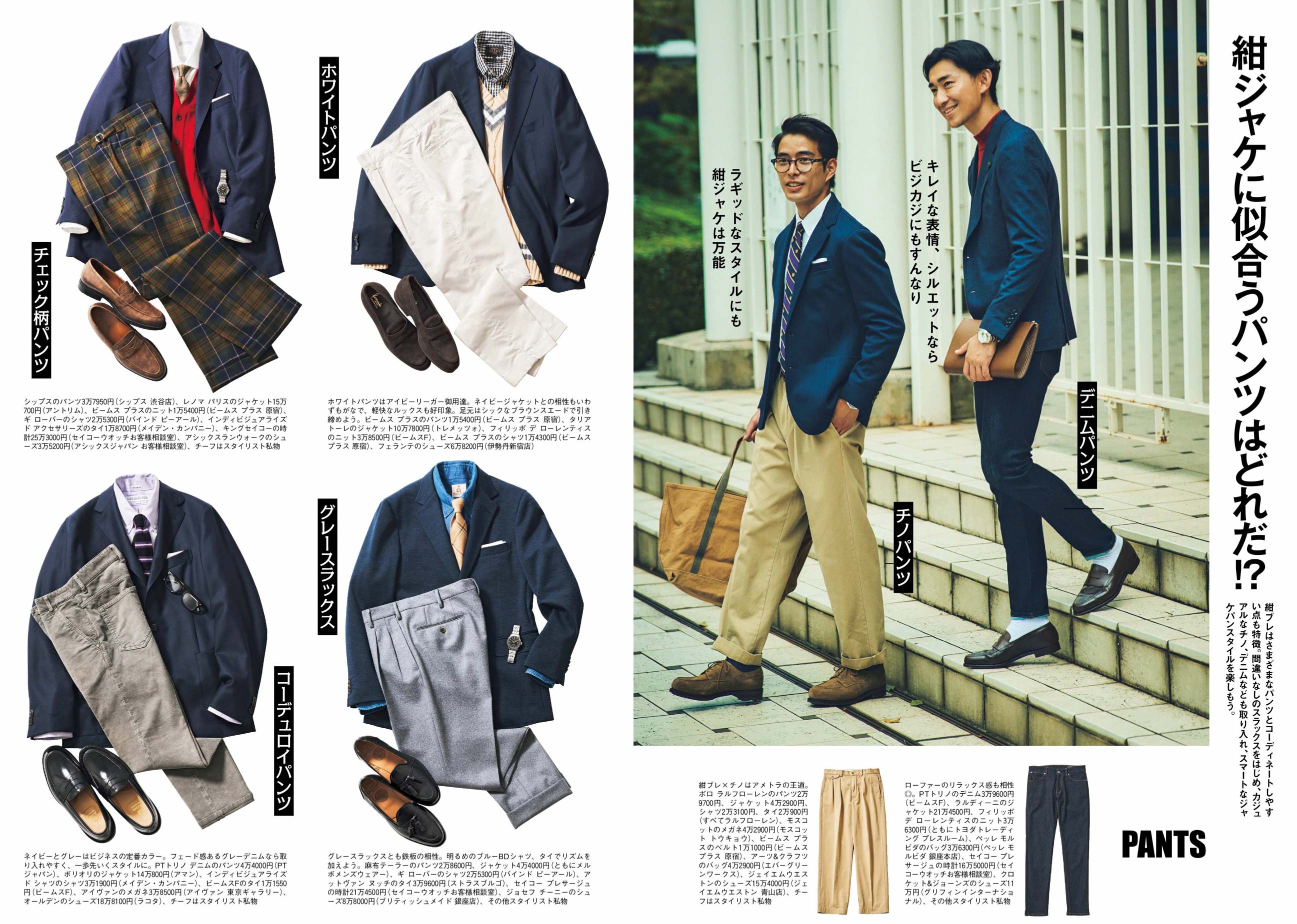 濃紺デニムも紺ブレと相性抜群。ワイドデニムなら今っぽさも出せるが、デニム自体カジュアルなので、甲部分にタッセル(房飾り)が付いたローファーでコーデを格上げ。