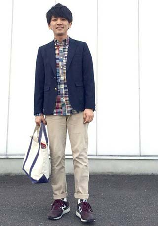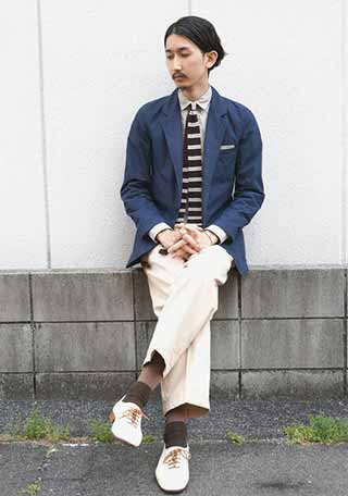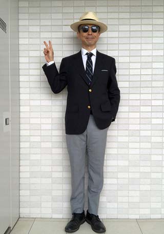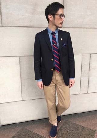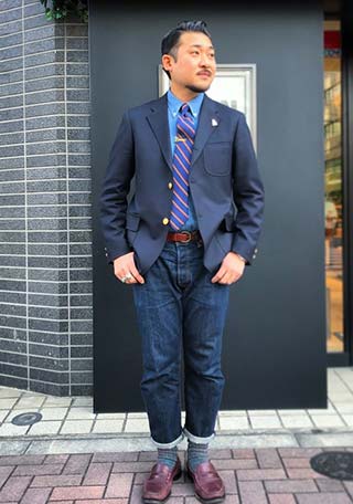 紺ブレ・チノパン・ローファーと、アイビールックを彷彿させる古きよきアメトラ。