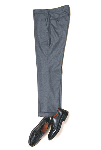 きれいめな着こなしを目指すならスラックスも一つの手。ノータックの細身&ウール素材の上品なパンツには、ローファーよりもウイングチップなどの短靴が◎。