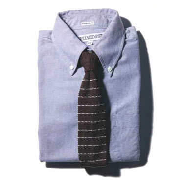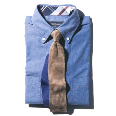 シャンブーレーシャツは現代的アメトラアイテム。カジュアル感が強いので、上品なシルクニットタイでトラッド感を出すと大人っぽく着こなせます。