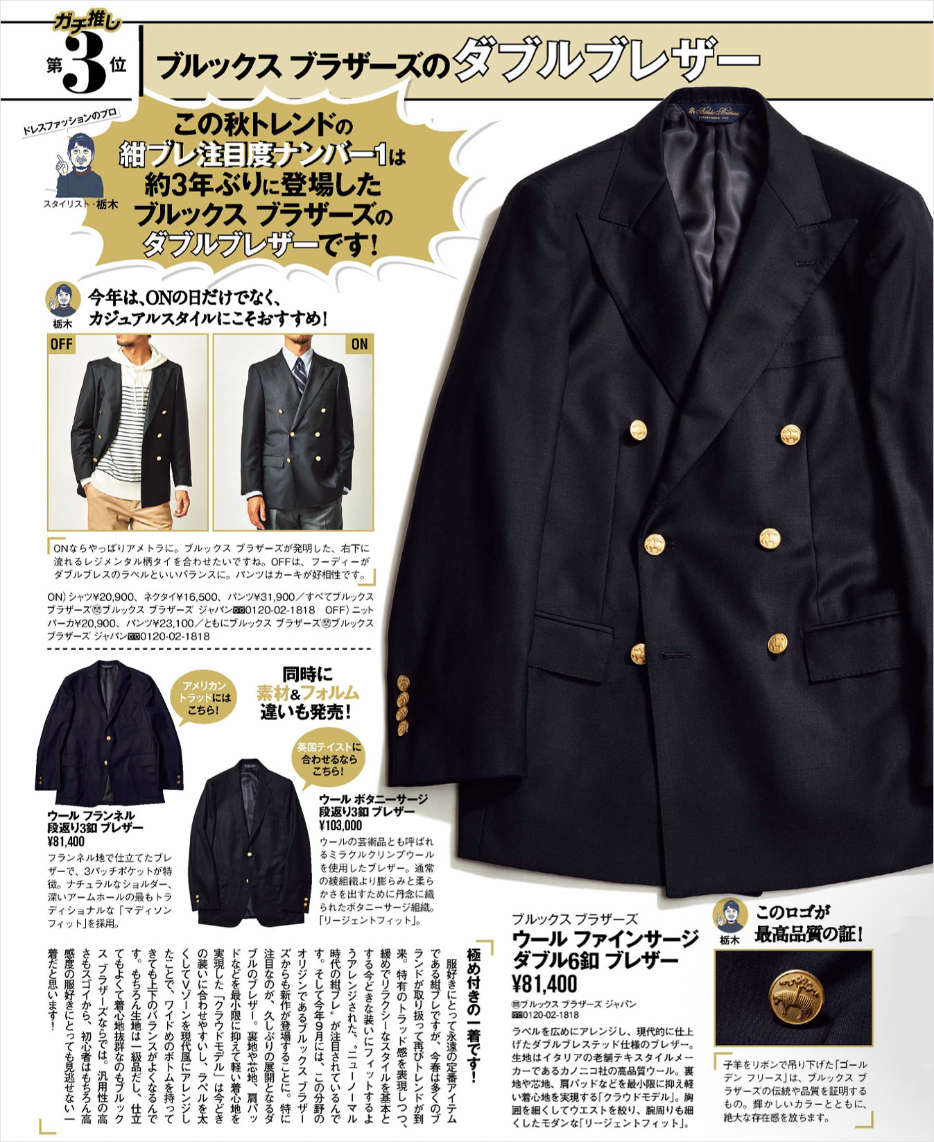 ゴールドは格調高アク、シルバーは若々しい印象に。ブルックスブラザーズの紺ブレは、同社のシンボル“ゴールデン フリース(金羊毛)”を刻印したメタルボタンを採用。