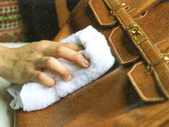 汚れ落とし、栄養補給、ツヤ出しの複合ローションを使用。真珠1粒大を布になじませ四隅から円を描くように塗布。