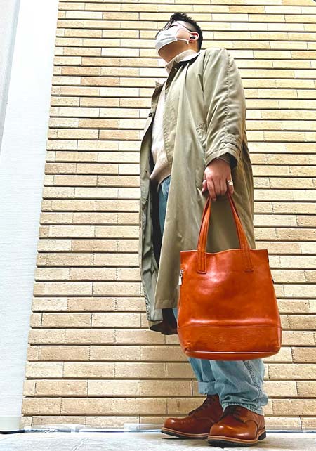縫製後に色付け・オイルを手塗りし、独特の発色と柔らかな表情を加えたレザートート。