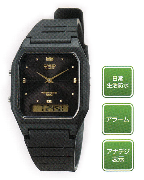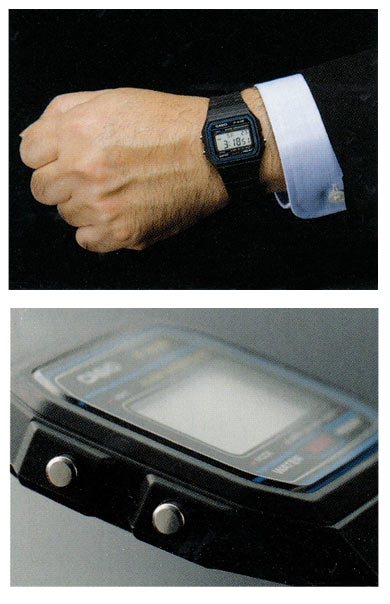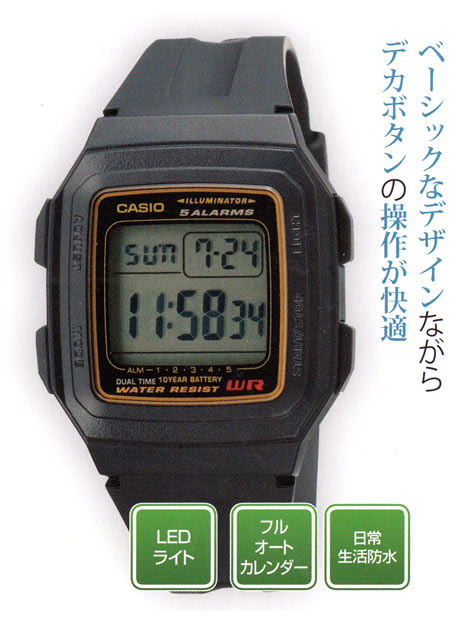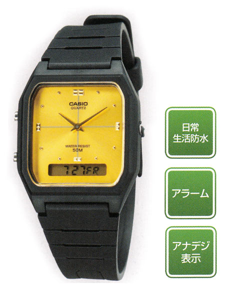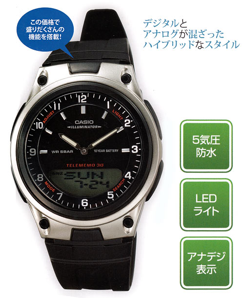 5気圧防水以外にも、電話番号メモリー、世界30都市の時刻表示、ストップウオッチ、アラームなど各種機能を搭載したモデル。見やすいアナログ表示と多彩なデジタル機能が融合したコストパフォーマンスが高いモデル。