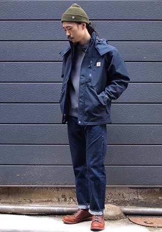 「ベージュ色マウンテンパーカー×デニム」に茶色プレーンブーツを。絶妙なカラーゆえ、ちょっとしたアクセントになります。