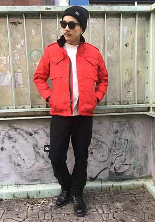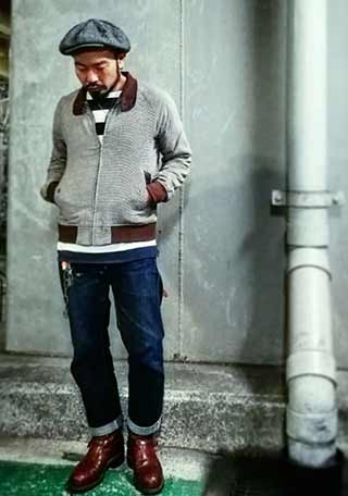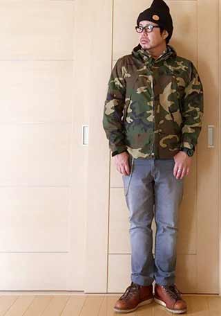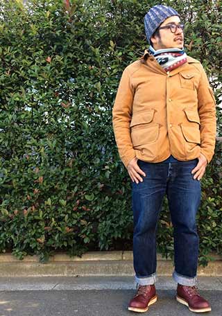 「ミリタリーのM65ジャケット×デニム」にツートンのブリッジマン持ってきた着こなし。ベージュ色が良い塩梅。