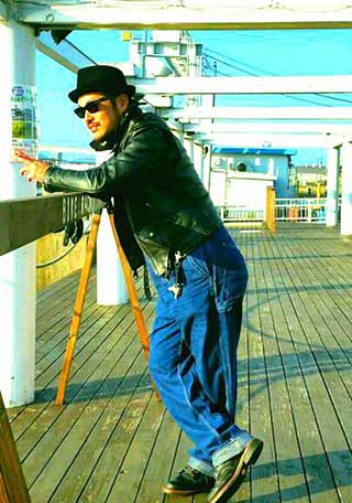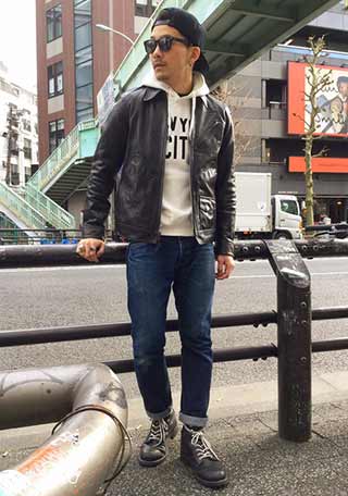 黒レザージャケット×黒エンジニアでクールにまとめあげたスタイル。デニムも濃い目でカッコよさを追求!