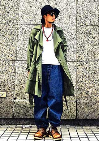 ミリタリーライクな「カーキ色モッズコート」に相性のいいブルーデニムをチョイス。足元のブーツ(茶色)がちょうどいい差し色となってバランスよくまとまっています。