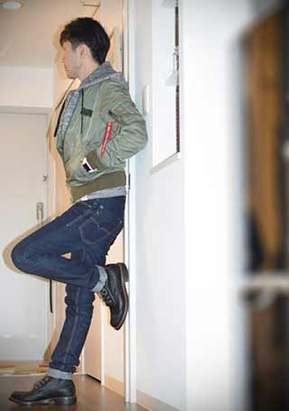 おしゃれなパパさんが履いているのは黒のモックエンジニア。黒MA-1と色をリンクさせているのはもちろん、何色とでも合わせやすいので1足目にはちょうどいい。