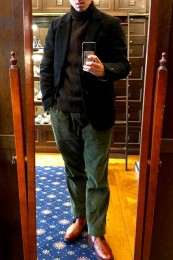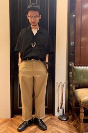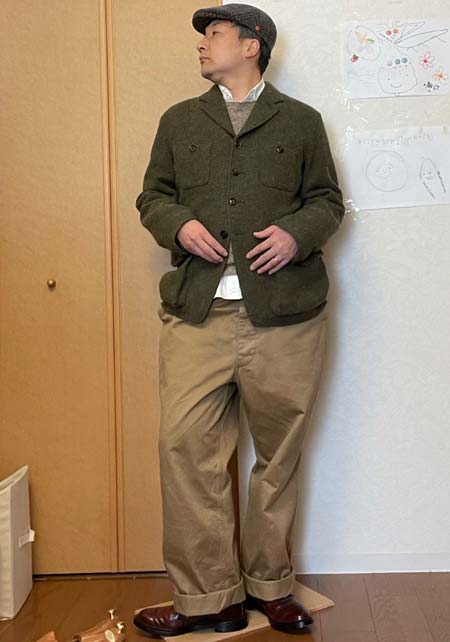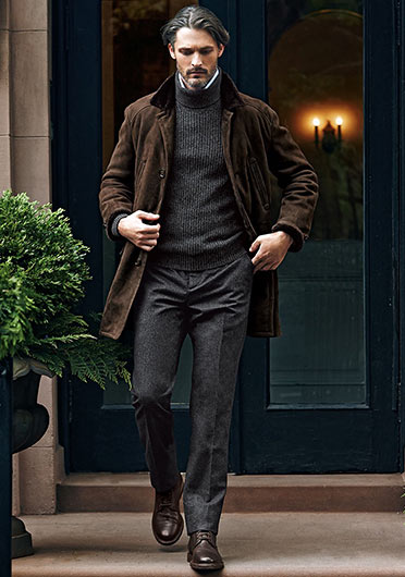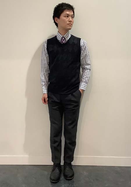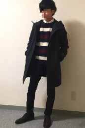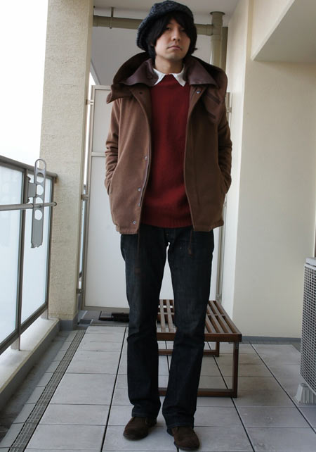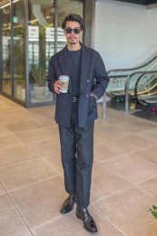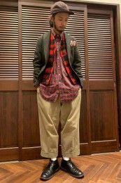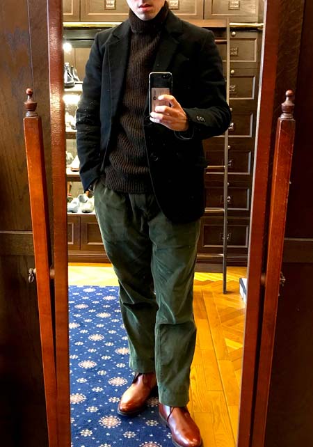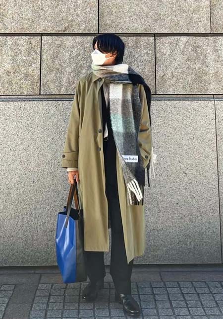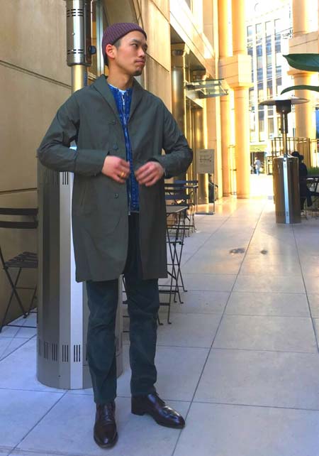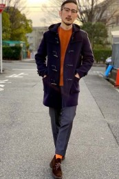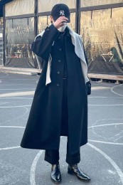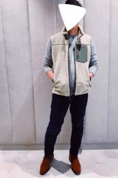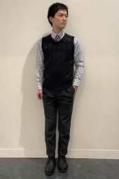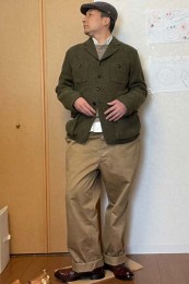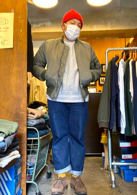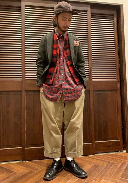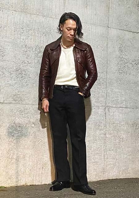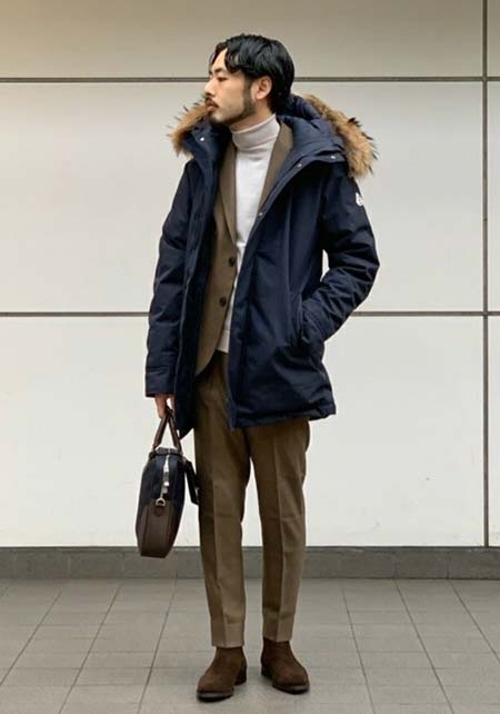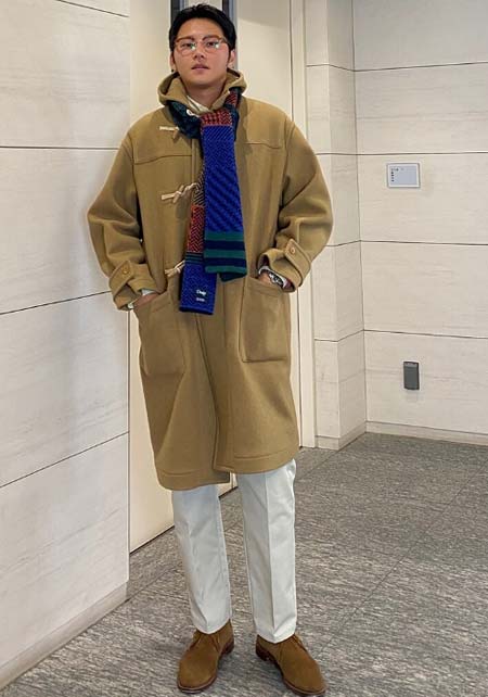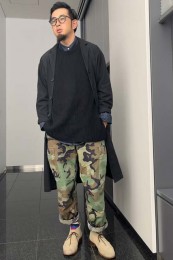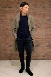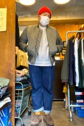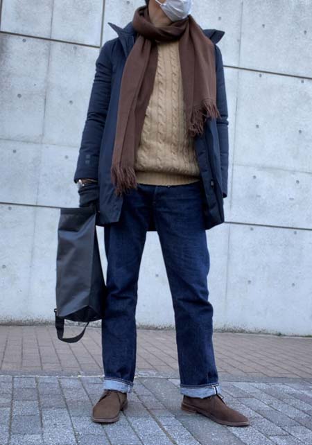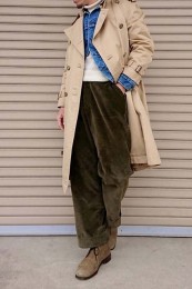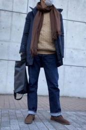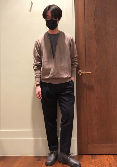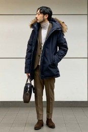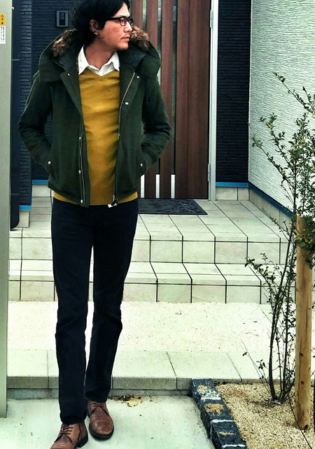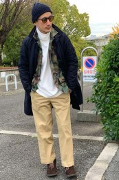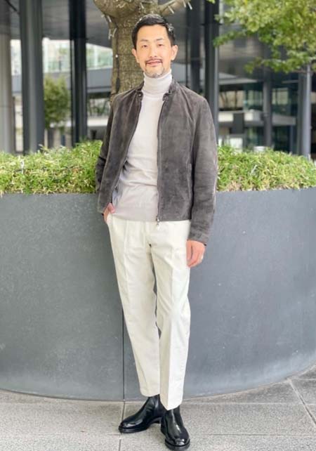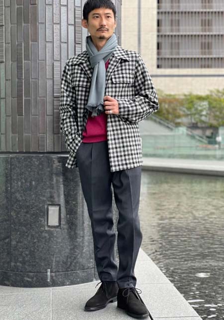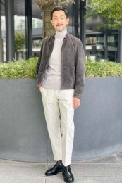 やや上品なイメージがあるのでジャケットやコートとは相性抜群。逆にブルゾンやGジャンに”品の良さをプラスする”アイテムとしても使えるので、実質合わせるアウターは選びません。