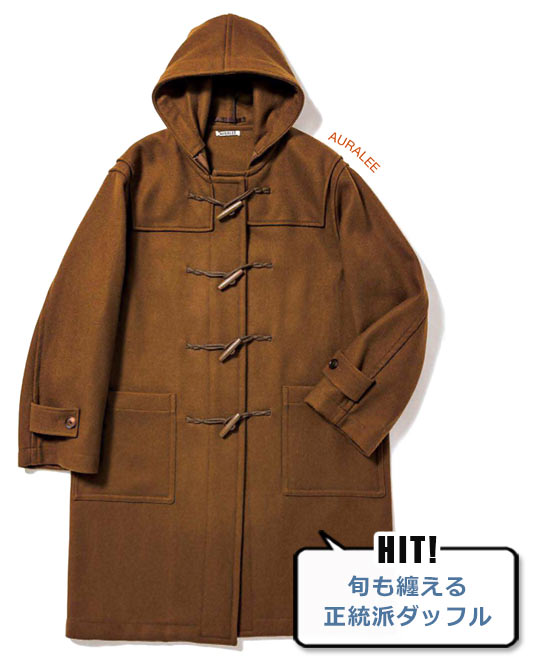 正統派トラッドなダッフルコートに、ゆとりある身幅とドロップショルダーで旬の空気感をまとわせたオーラリー。3種類の英国産ウールをブレンドし、高密度に織り上げたオリジナルのハードメルトンは、ハリとコシのあるタフな風合いです。