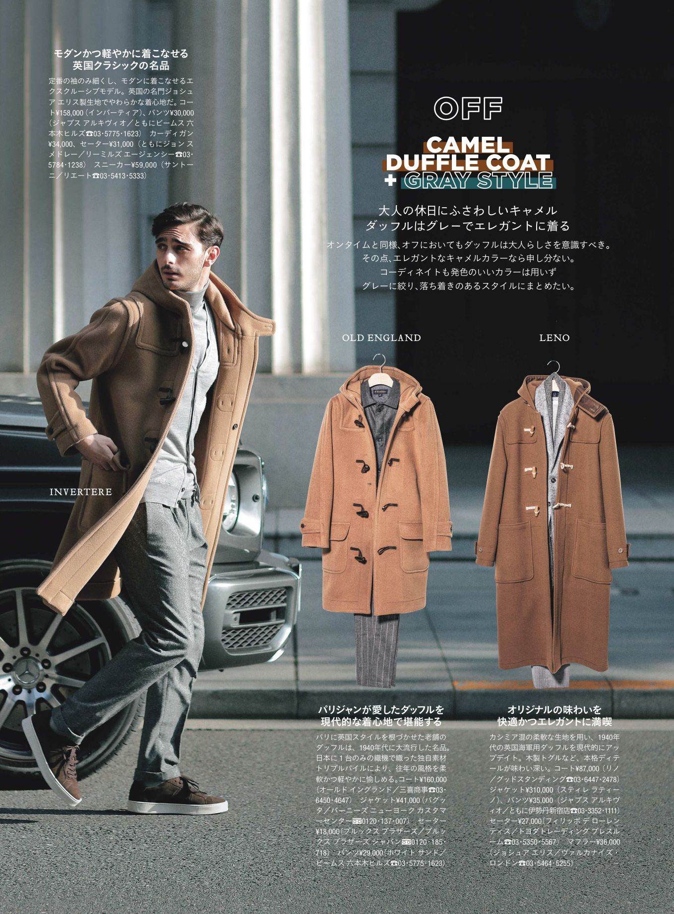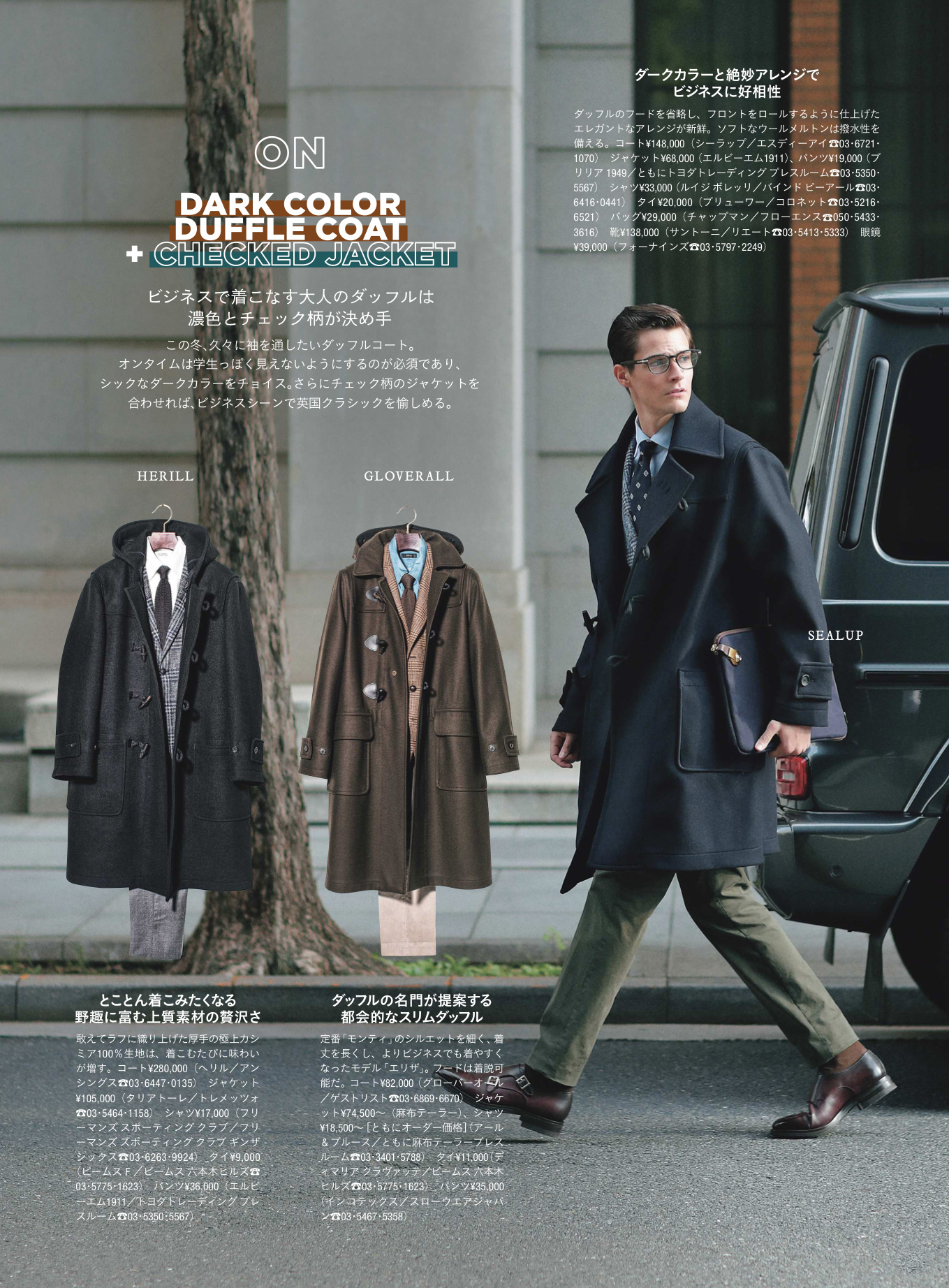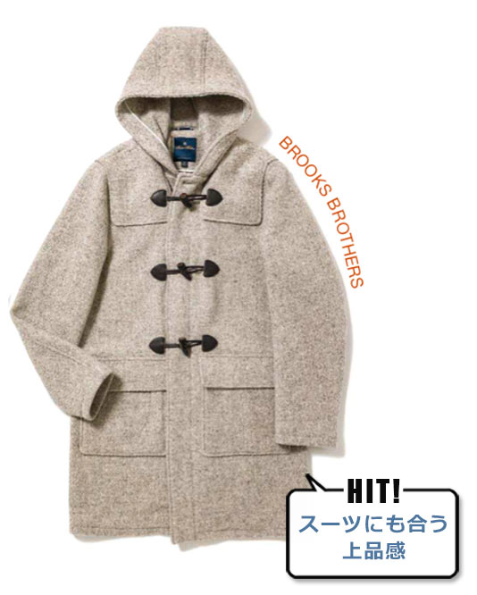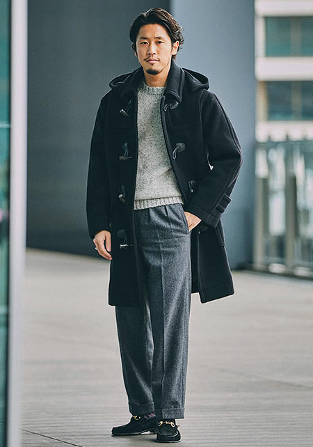 極端なドロップショルダーはスーツになじまず、だらしがない印象を与えてしまうことも。ビジネスシーンでは肩が落ちすぎないものを選ぶのが鉄則です。またダッフルの顔ともいえるトグルの表情も重要。重厚なホーンやループで、品よく高級感のある装いに見せましょう。