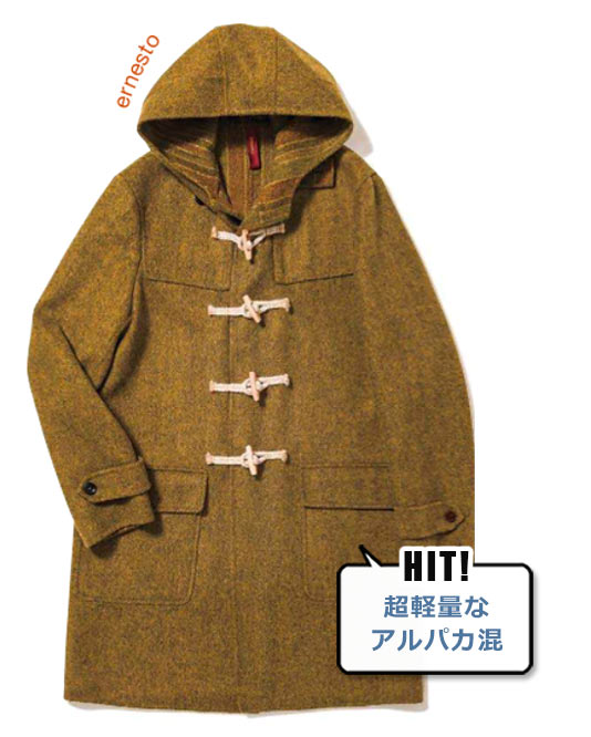 はおった瞬間驚くのはその軽さ! ダブルフェイスのアルパカ混ウールで仕立てたダッフルは、同ブランドのジャケット同様、ストレスフリーな着心地。ニュアンスのあるマスタードカラーや裏地からのぞく洒脱なストライプで差別化は必至。