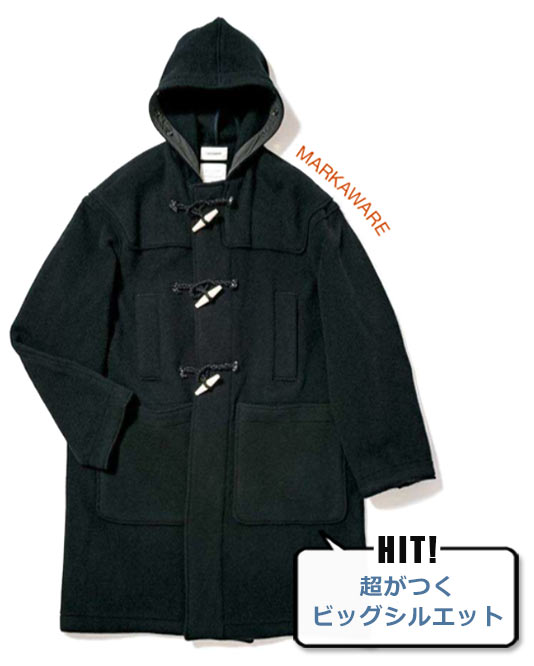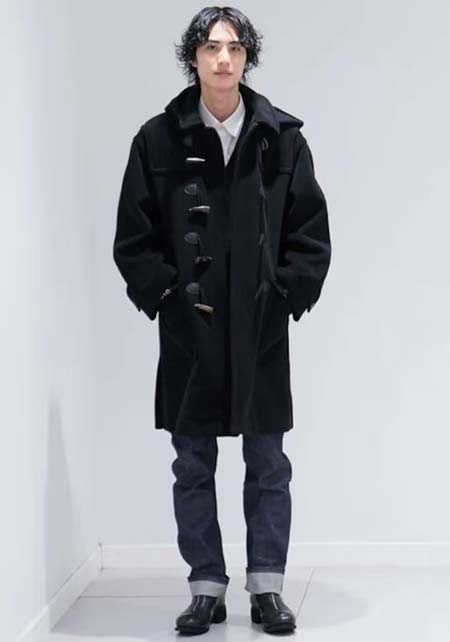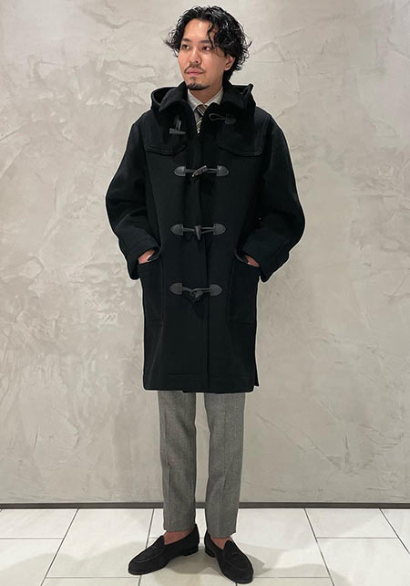 モードにしてクラシック、クールでいてどこか色気も醸せる。そんな男の万能色ブラックのダッフルコートは、シンプルなデザインゆえにスーツからカジュアルまで汎用性も抜群。コンパクトな肩まわりとゆとりのある身幅のコントラストがAラインを描き、すっきりとした見栄えをかなえます。