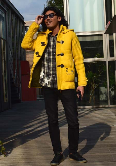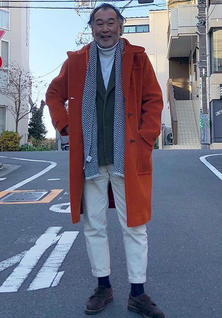 紺や黒のダッフルはオンオフを問わず使えてオールマイティな反面、無難な着こなしに陥ってしまいがち。そこで投入したいのが、カラフルに出そろった冬小物。発色のいいイエローのカシミヤマフラーは、紺や黒とのコントラストがさえ、顔映りも抜群です。