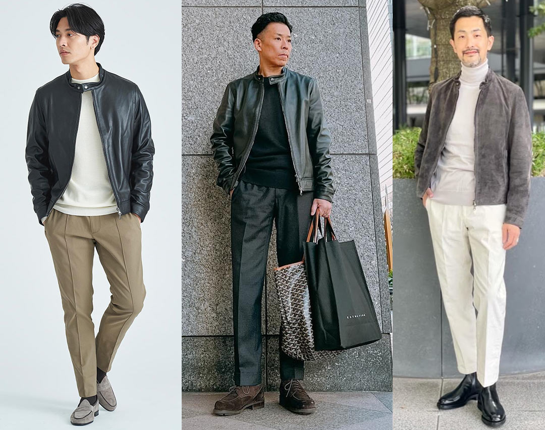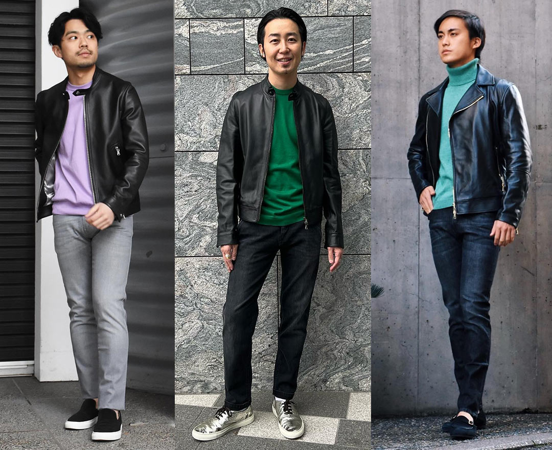 まずは黒色を選びがちなレザージャケット。そこに「差し色+重たい印象の中和」という効果をもたらしてくれるのが色物です。