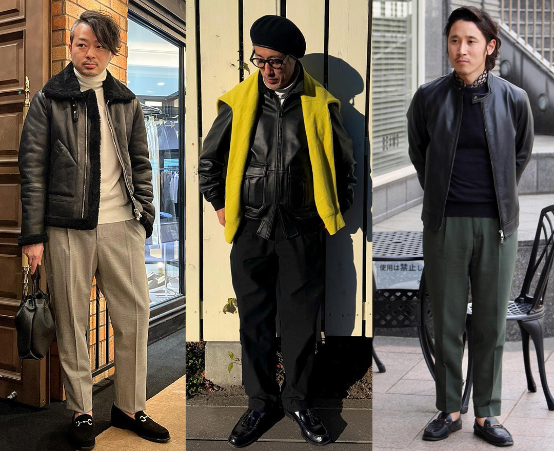 また、男らしいレザージャケットでもローファーが似合うのは、エンメティならではです。