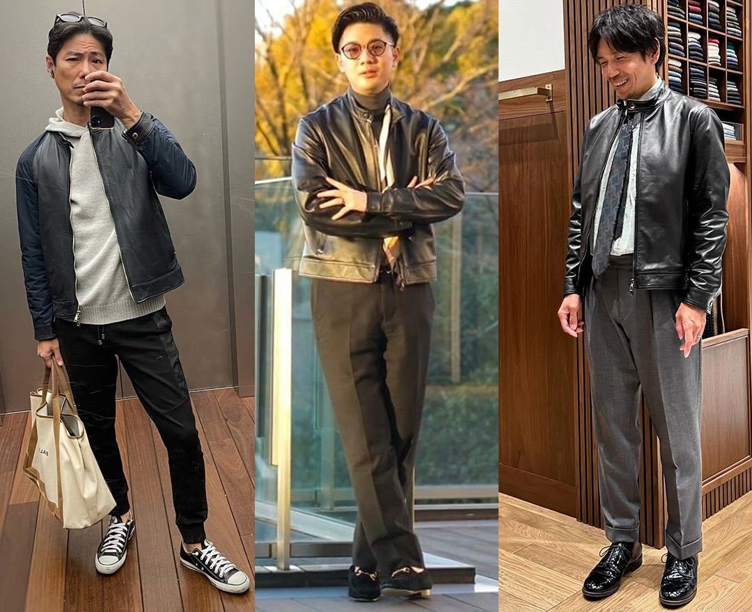 もしワイドパンツを合わせたい場合は、レザージャケットをワンサイズ上げるか、ゆとりのあるA2タイプのレザージャケット(モデル名:AKRON)を選ぶのが近道です。