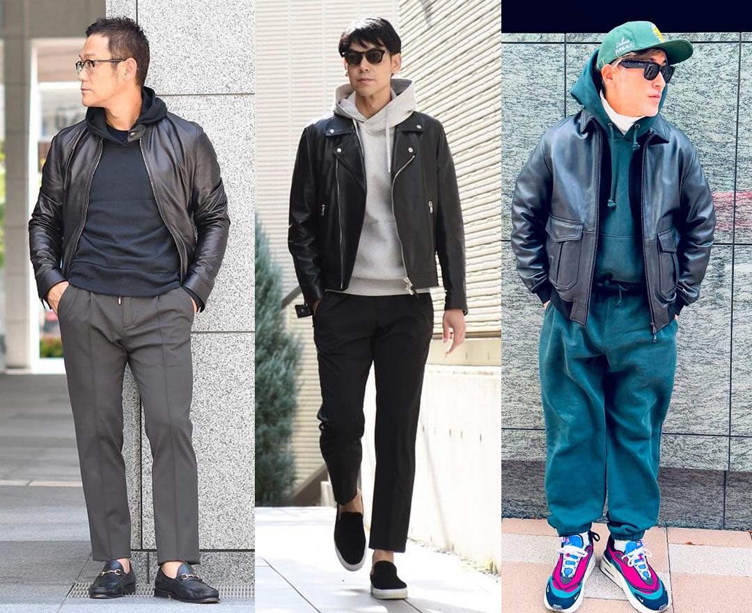レザージャケットをカジュアルに寄せてくれるパーカー。