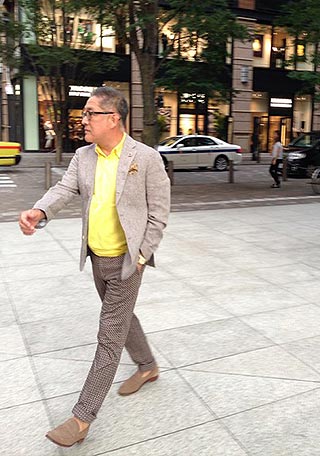 発色の良いイエローポロシャツをジャケットにIN。差し色もさることながら、ジャケットとすんなり馴染む相性の良さはジョンスメドレーならでは。