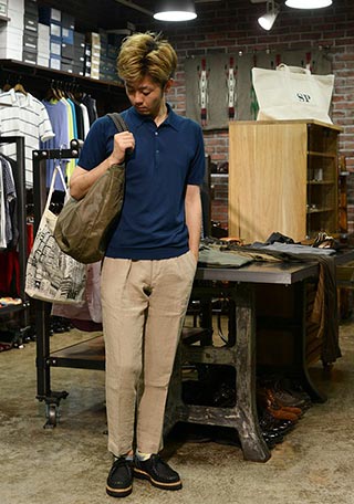 オーソドックスなベージュパンツに合わせただけ。それだけなのに引き寄せられる魅力がこのポロシャツにはあります。