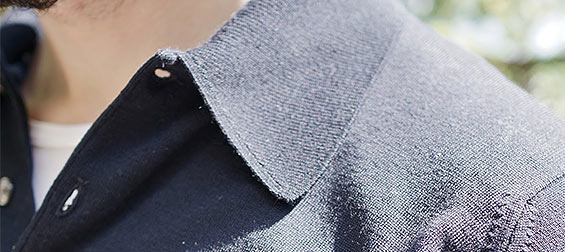 素材以外にも特徴的なのが、減らし目特有のポロイングリッシュカラー。この形の襟を使用する事により、カジュアルな印象が強いポロシャツも、上品な雰囲気になり、ジャケットのインにも最適な一枚です。