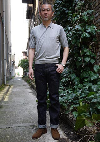 グレーポロシャツに、上品さとカジュアルさの良いとこ取りな濃紺ジーンズをチョイス。休日~お出かけまで幅広いシーンに対応できます。