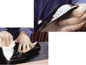 汚れやホコリに加えて気をつけたいのが、古くなった靴クリーム。革の毛穴を綺麗にするため液体クリーナーで取り除きます。