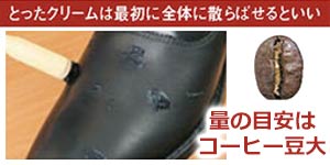 片側の靴で、だいたい小指の先やコーヒー豆程度の量でケアには充分です。小さいブラシに取ったら、それを全体に塗り広げます。塗りすぎは、かえって光沢をなくす原因になるので注意。