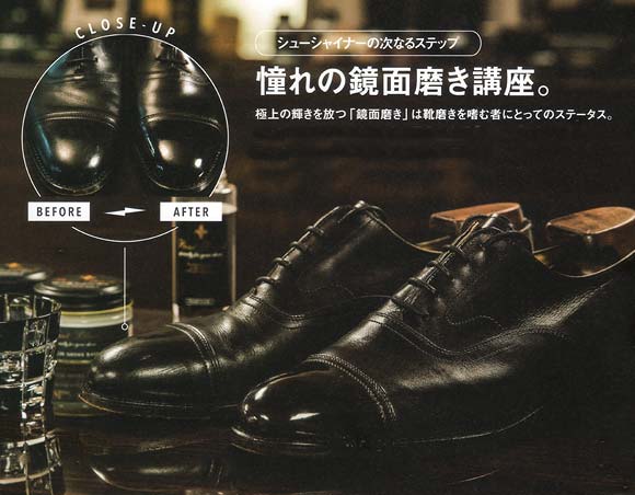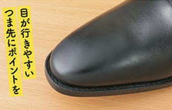 対面したときに目が行きやすい「つま先」と後姿の印象を決める「かかと」がお洒落のポイントで、ここのみを光らせましょう。全体をピカピカに磨くと、やりすぎな印象に。