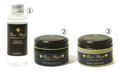 ④靴クリーム:水分と油分を含んだ乳化性のクリームで、革に潤いと栄養を与えます。